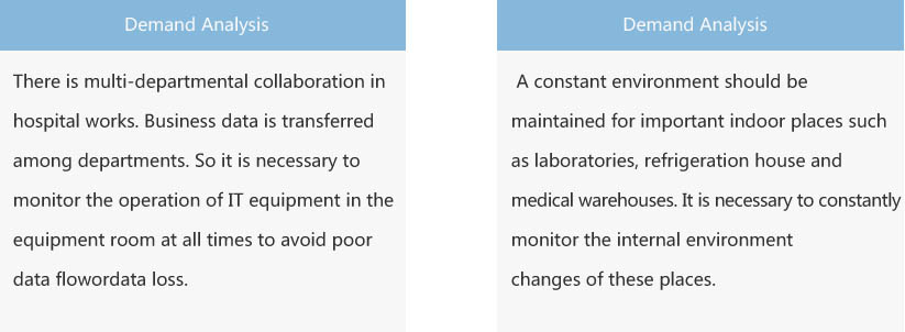 There is multi-departmental collaboration in hospital works.Business data is transferred among departments. So it is necessary to monitor the operation of IT equipment in the equipment room at all times to avoid poor data flowordata loss.