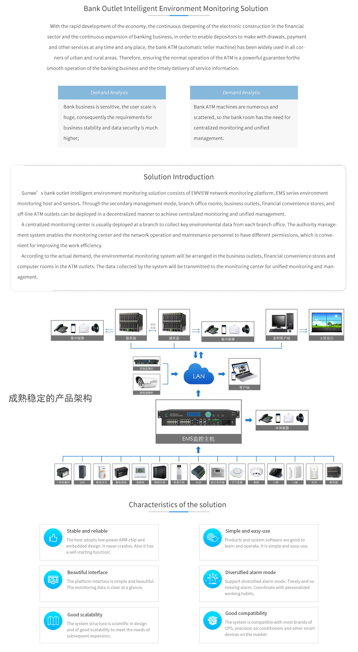 Sunwe’s bank outlet intelligent environment monitoring solution consists of EMVIEW network monitoring platform, EMS series environment monitoring host and sensors. Through the secondary management mode, branch office rooms, business outlets, financial convenience stores, and off-line ATM outlets can be deployed in a decentralized manner to achieve centralized monitoring and unified management.